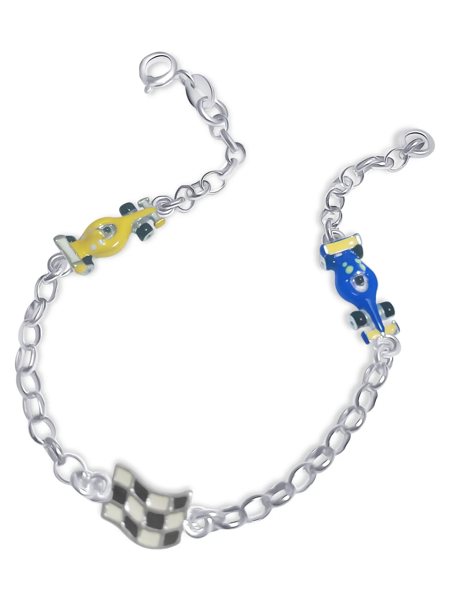Βραχιόλι, παιδικό, ασημένιο, για αγόρια, με σμάλτο διπλής όψης, 18 εκατοστών τελικό μήκος, free size, με φόρμουλες, αγωνιστικά αυτοκίνητα και σημαία εκκίνησης αγώνα, με άσπρο επιπλατίνωμα χωρίς νικέλιο, woofie, 0230352301,