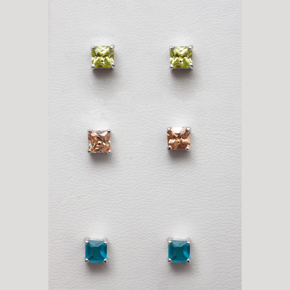silverline, 3 ζευγάρια ασημένια σκουλαρίκια μονόπετρα, καρφωτα 4Χ4χιλιοστά, unisex, με ζιργκόν γαλάζιο, λαδί & σαμπανιζέ
